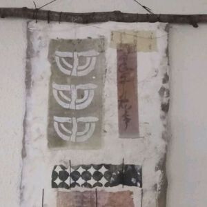 2021Zie video onder. Rol van oud laken met takken uit het bos. 168 cm hoog, 42 cm breed. Op te hangen of opgerold neer te leggen